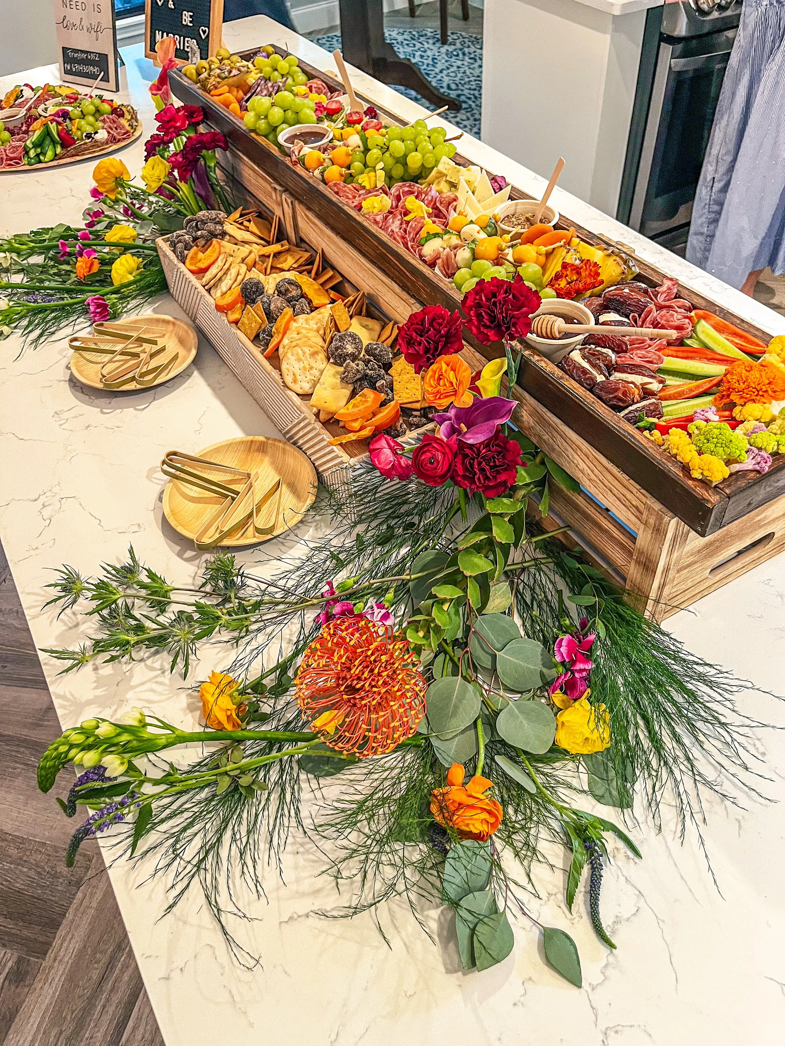 A standout center piece charcuterie spread thoughtfully arranged on crates with florals for THE display of the night. Let us know your flower color preference.